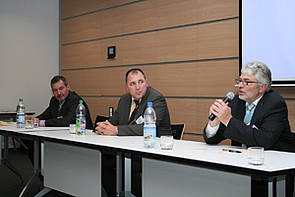 Das Podium der 3. NWI-Konferenz (v.l.n.r.): José Montero, VR Bank Rhein Neckar, Klaus Schulz, SHE Informationstechnologie AG, Klaus Dinges, KilianDruck