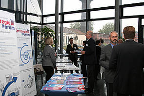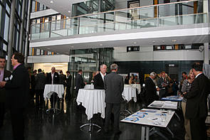 Blick ins Foyer des MAFINEX Technologiezentrums: Hier präsentierten sich bei der 3. NWI-Konferenz 14 Stände, darunter NWI-Partner, die Wirtschaftsförderung Mannheim und MAFINEX-Mieter